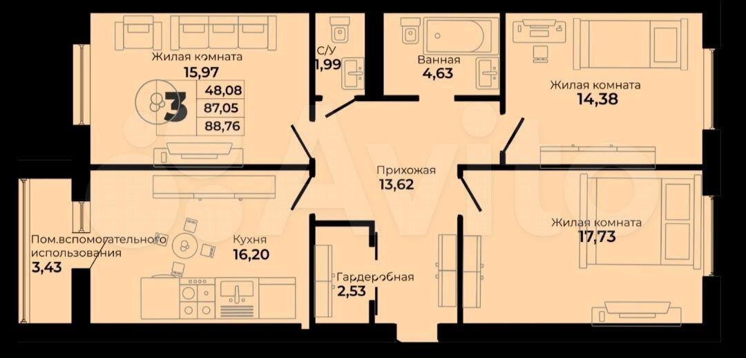 3-к. квартира, 88,8 м², 5/9 эт.