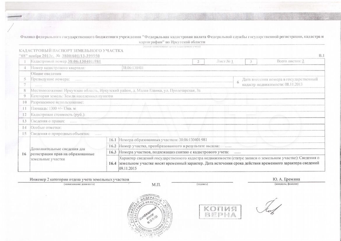 Объект права: Земельный участок, категория земель: земли населённых пунктов, разрешённое использование: индивидуальные жилые дома, общая площадь 1300 кв.м. адрес объекта: ИО, Ирк. р-он, д. М. Еланка, ул. Пролетарская, 3а.
