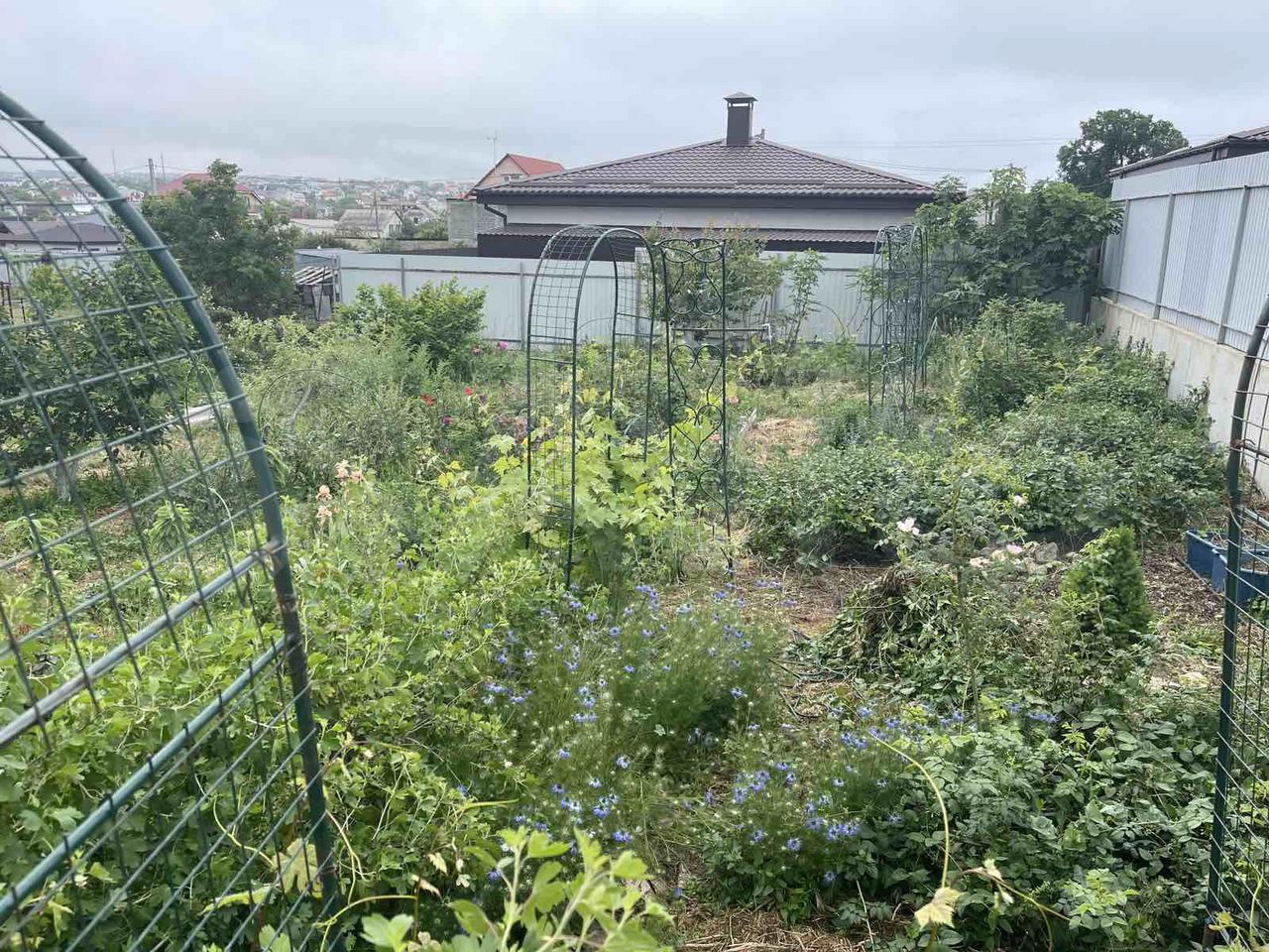 На участок заведено электричество 3 фазы и вода. На участке накопительная емкость для воды на 5 м3 и небольшой металлический сарайчик. Участок используется под огород и засажен разными зелеными насаждениями и цветами.