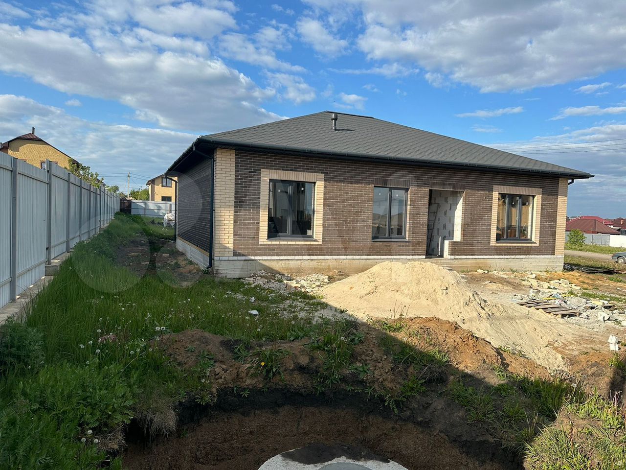 Продаётся одноэтажный дом. Липецкий район д. Кулешовка ул. Радужная 29. Участок 15 сот. Фундамент свайно-ростверковый. Дом выполнен в современном стиле, баварская кладка из качественного керамического кирпича + газосиликатный блок Хебель 300мм. Высота этажа 3 метра. Перекрытья П. К. Выполнен монтаж электричества с подключением. Канализация 3 кольца септик. Монтаж газа, монтаж отполения, тёплый пол + батареи. Штукатурка стен, чистовая стяжка пола. Она КВЕ в 3 стекла. Дом готов под чистовую отделку. Звоните и приезжайте на просмотр.