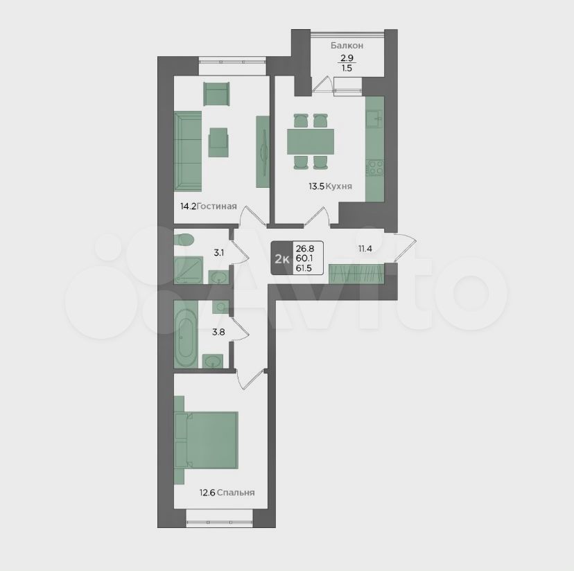 Общая площадь 61,5 кв.м, комнаты изолированные, выходят на разные стороны, 13 и 14 кв.м, просторная кухня 13,5 кв.м с выходом на лоджию 3 кв.м, два раздельных санузла, при желании из одного можно сделать гардеробную, вместительный коридор 11,4 кв.м, куда очень удачно впишется большой шкаф-купе, квартира не угловая!