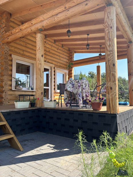 Большая крытая терраса у дома и бани