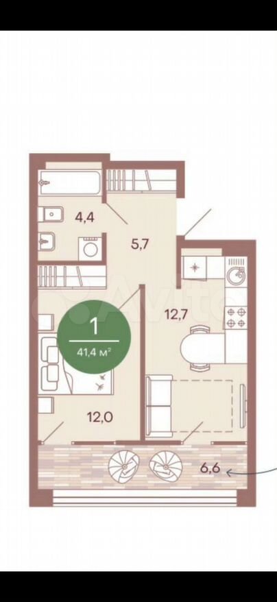 Черновая отделка от застройщика, общая площадь 34,4 м2, жилая площадь 12 м2, прихожая 5,7 м2, кухня 12,6 м2, комната 12 м2, ванная 4,1м2, лоджия 6,6 м2.