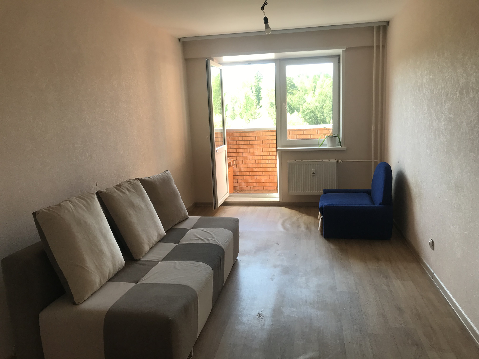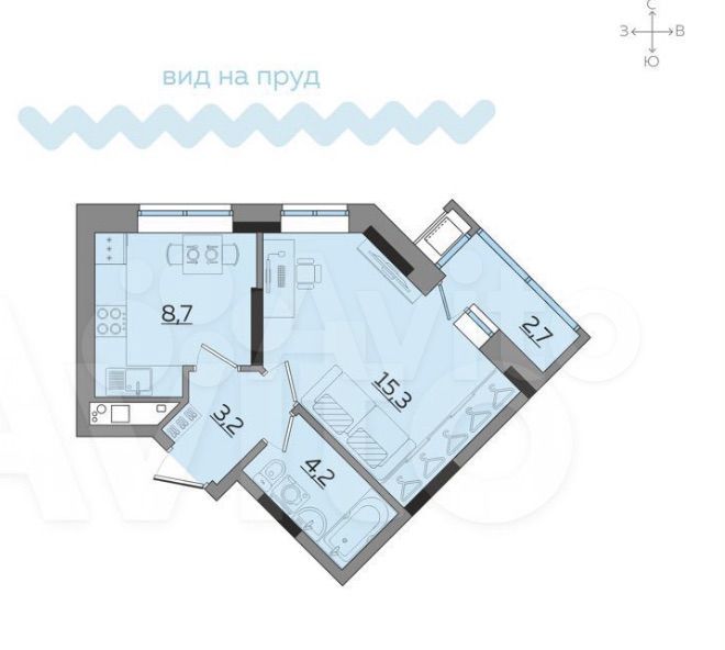 Однокомнатная квартира улучшенной планировки на две стороны света. Комната светлая - 2 окна, уровень подоконника 60 см от пола, высота окна 1,7 м. Окна выходят на север и восток - на пруд, набережную ...