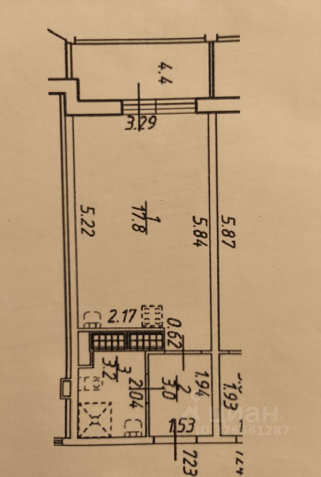 Продается 1-комнатная квартира. Общая площaдь - 33,3 кв.м., жилая площадь - 16,6 кв.м., кухня - 9,8 кв.м., санузел - 3,5 кв.м., балкон - 2,6 кв.м., высота потолков - 2,52 м. Общая планировка квартиры ...